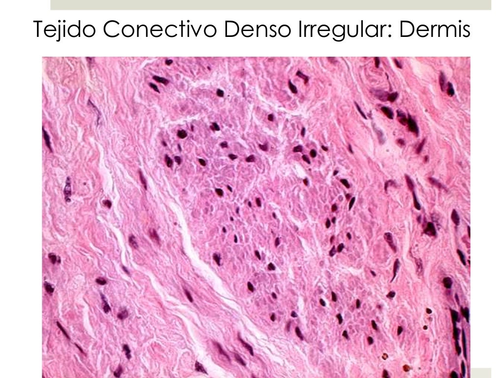 TCDI (Tejido conectivo denso irregular/no modelado): Fibras de colágeno que están entrelazadas, recorren distintas direcciones y esto le permite formar capsulas de los órganos. Ej. La dermis, pericondrio, duramadre. Tiene forma de red y crea soportes